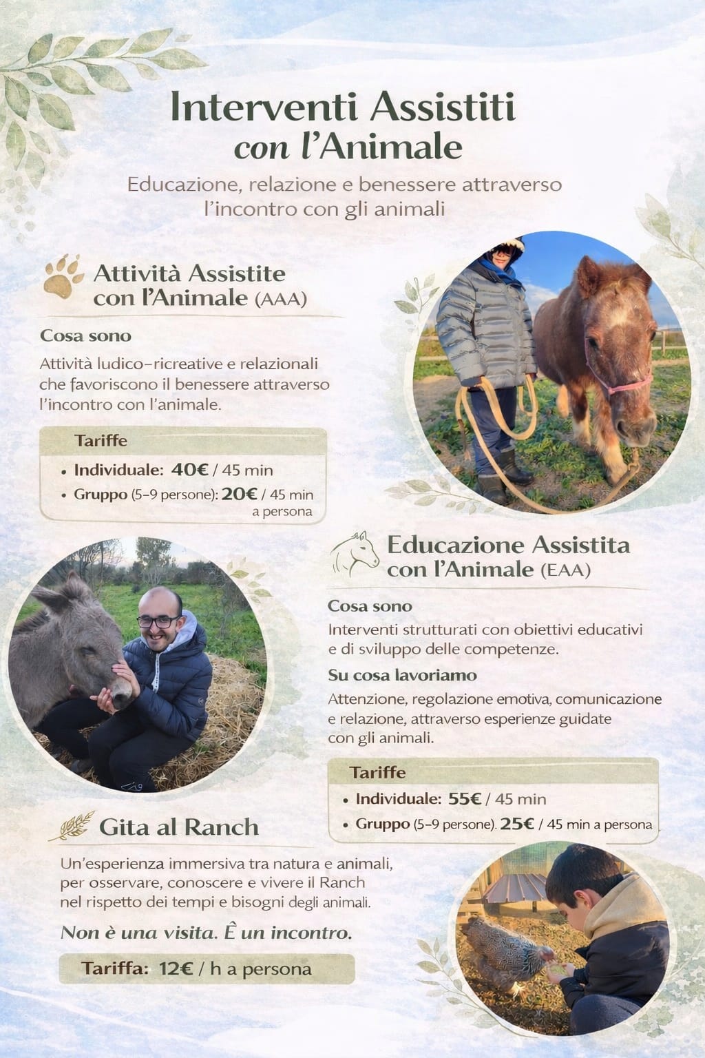 I Servizi Educativi Naturalistici e Interventi Assistiti con l’Animale (comunemente chiamati Pet Therapy) sono pensati per offrire un’alternativa ai classici servizi socio-educativi e socio-riabilitativi svolti in un setting chiuso e spesso asettico, andando ad apportare benessere alle persone integrando ai modelli educativo-riabilitativi classici la relazione con la natura e gli animali.